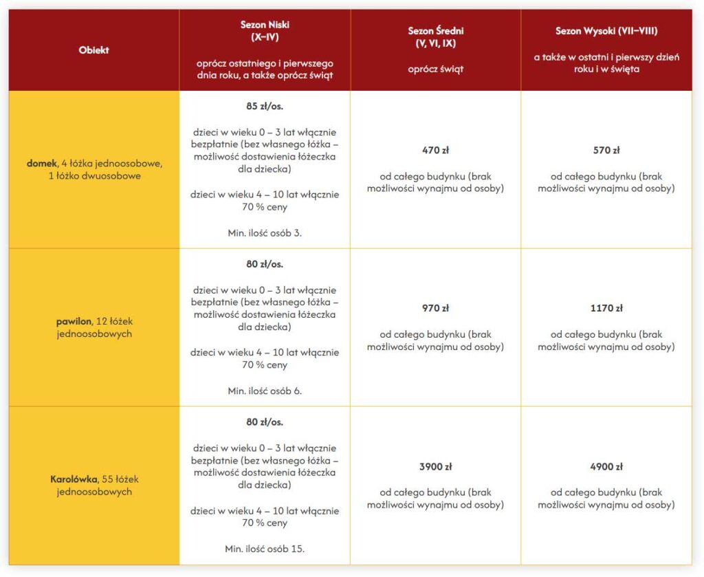 Domki • Pawilony • Karolówka | sezon niski • średni • wysoki