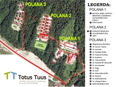 Dom oazowy. To drugi budynek na pierwszej polanie. Przeznaczony jest głównie na rekolekcje dla dzieci i młodzieży. Może pomieścić 53 osoby w 12 pokojach. Jest tak zaprojektowany i wyposażony, aby mógł spełniać rolę samodzielnego domu, dając gwarancję wyciszenia i skupienia każdej z przebywających w nim grup.
