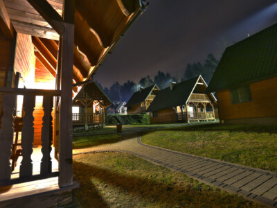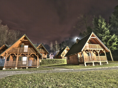 15 bungalowów. Samodzielnych całorocznych domków na trzeciej polanie to ostatnia część naszego ośrodka Każdy z nich składa się z w pełni wyposażonej kuchni, łazienki, trzech sypialni oraz salonu z kominkiem. Każdy domek może pomieścić 6 osób.